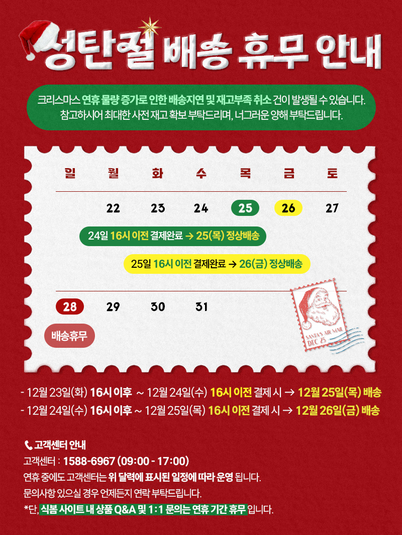 • 택배배송의 경우, 주말 및 공휴일 전일 및 당일에는 상품 발송이 어려울 수 있습니다.