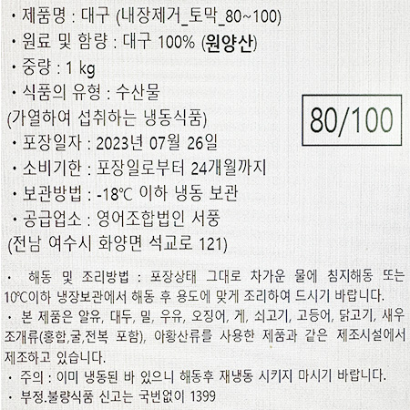 서풍 민대구(내장제거_80~100g/토막 1Kg/EA)