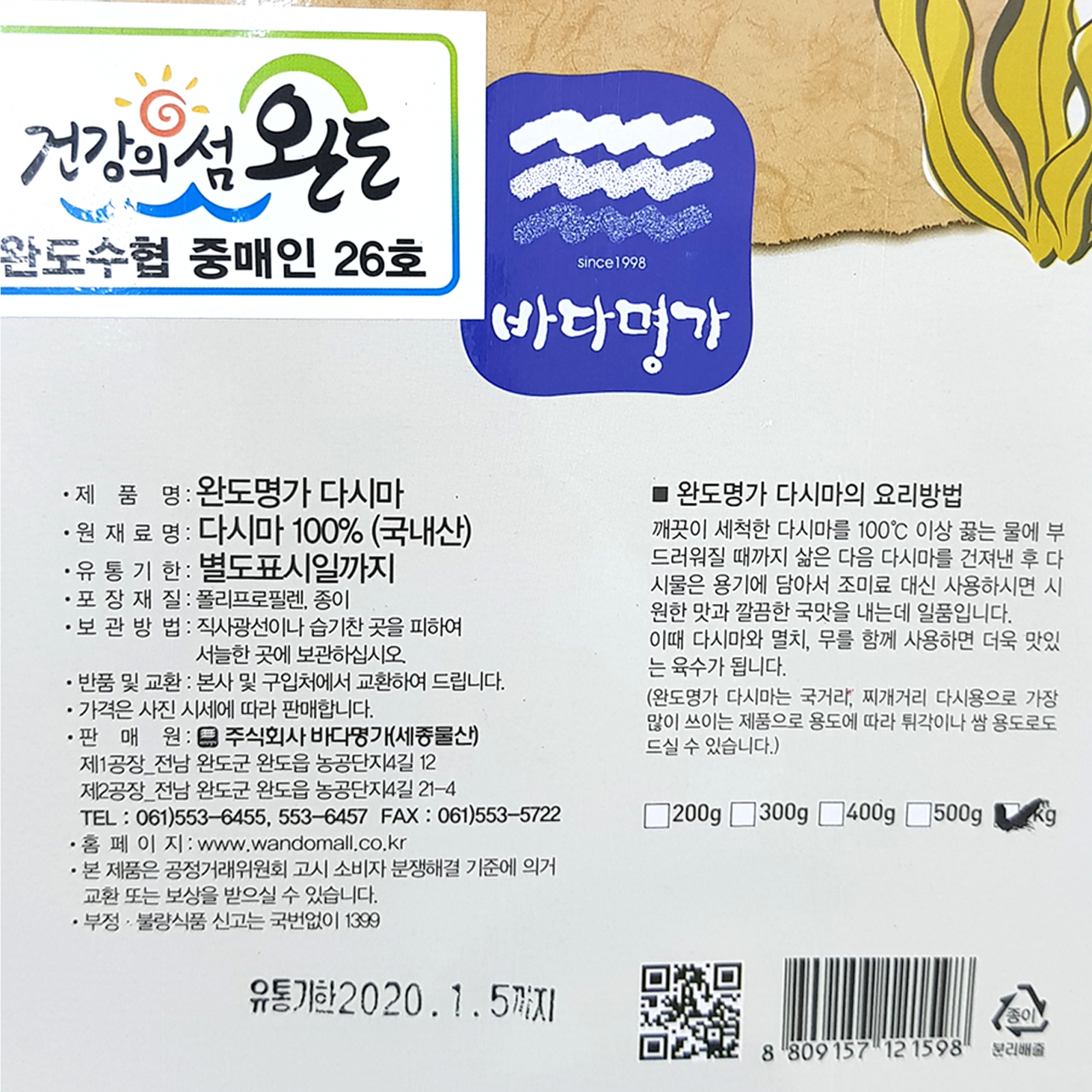 완도명가 건다시마(전남도지사인증_품질인증 1Kg/EA)