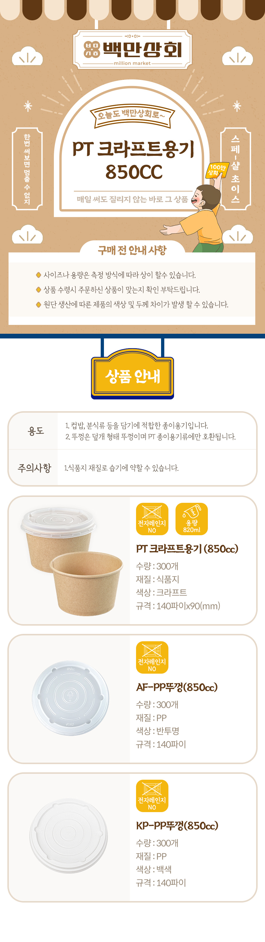 [샘플] PT 종이용기 내추럴크라프트(850cc) 1개