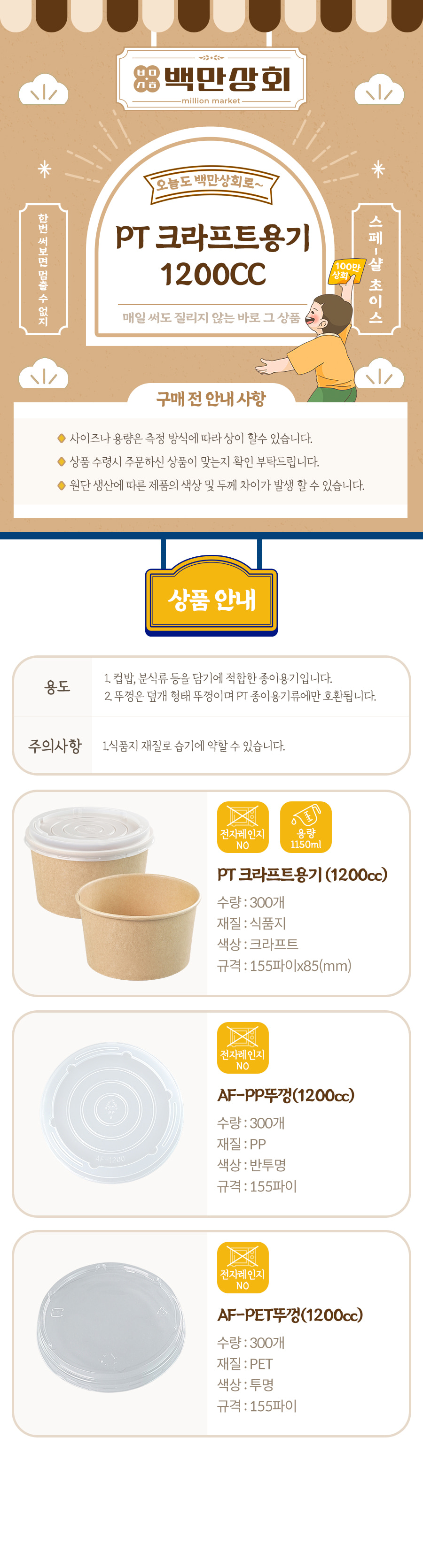 [샘플] PT 종이용기 내추럴크라프트(1200cc) 1개
