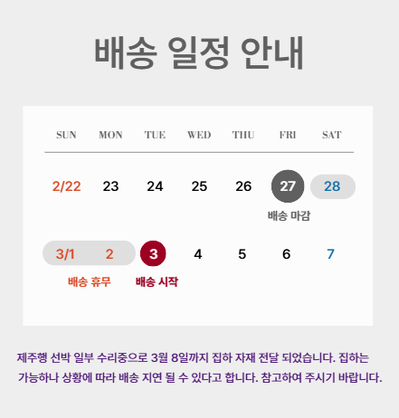- 택배 배송 : 당일 2시까지 주문건 당일택배 발송(주말.공휴일제외)
