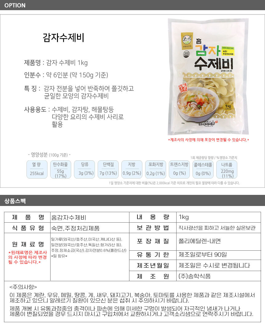 균일한 모양의 감자수제비로 수제비 및 감자탕, 해물탕, 매운탕 등 다양한 요리의 수제비 사리로 많이 사용합니다.