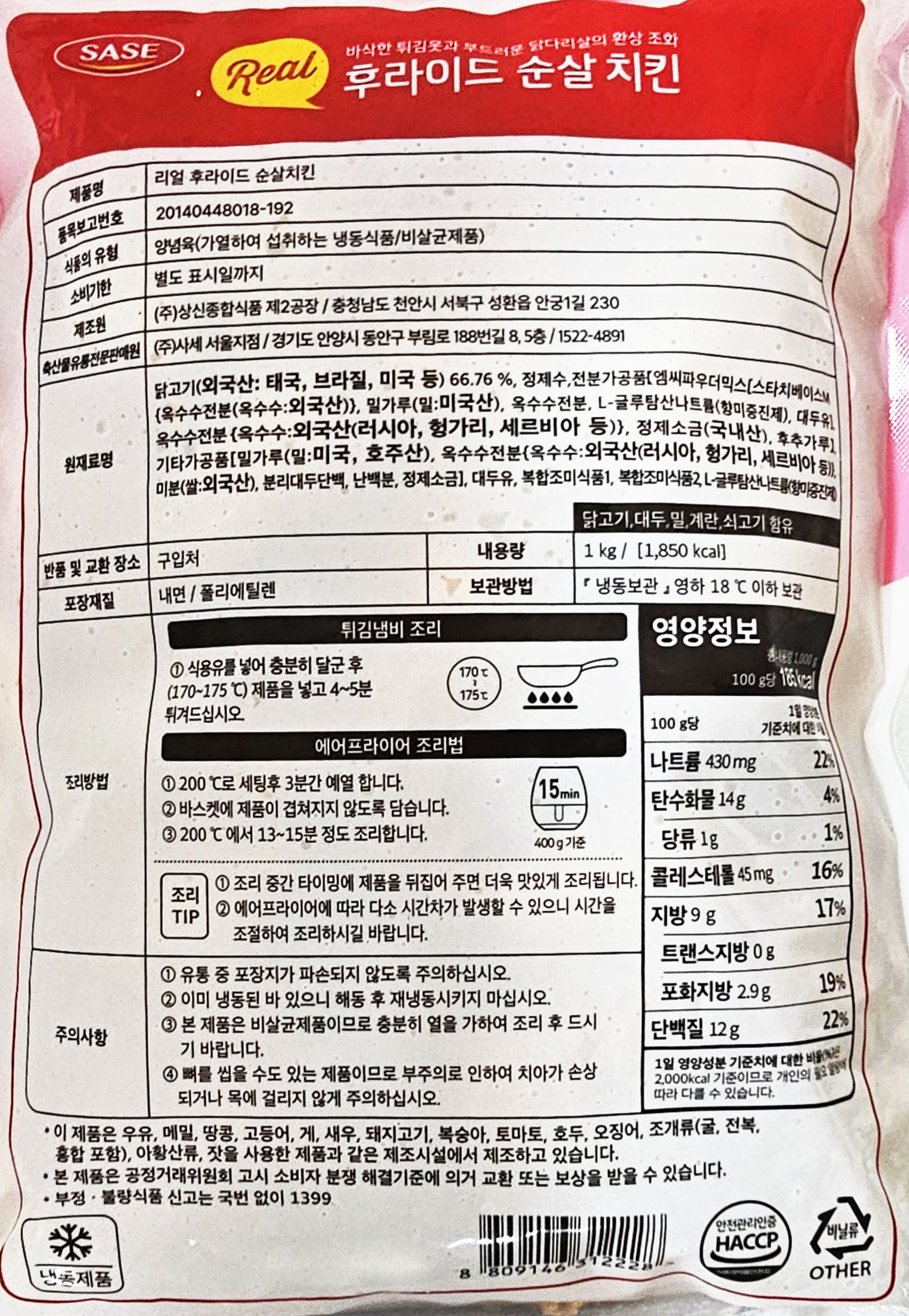 사세 리얼 후라이드 순살치킨 1kg 닭다리살 가라아게