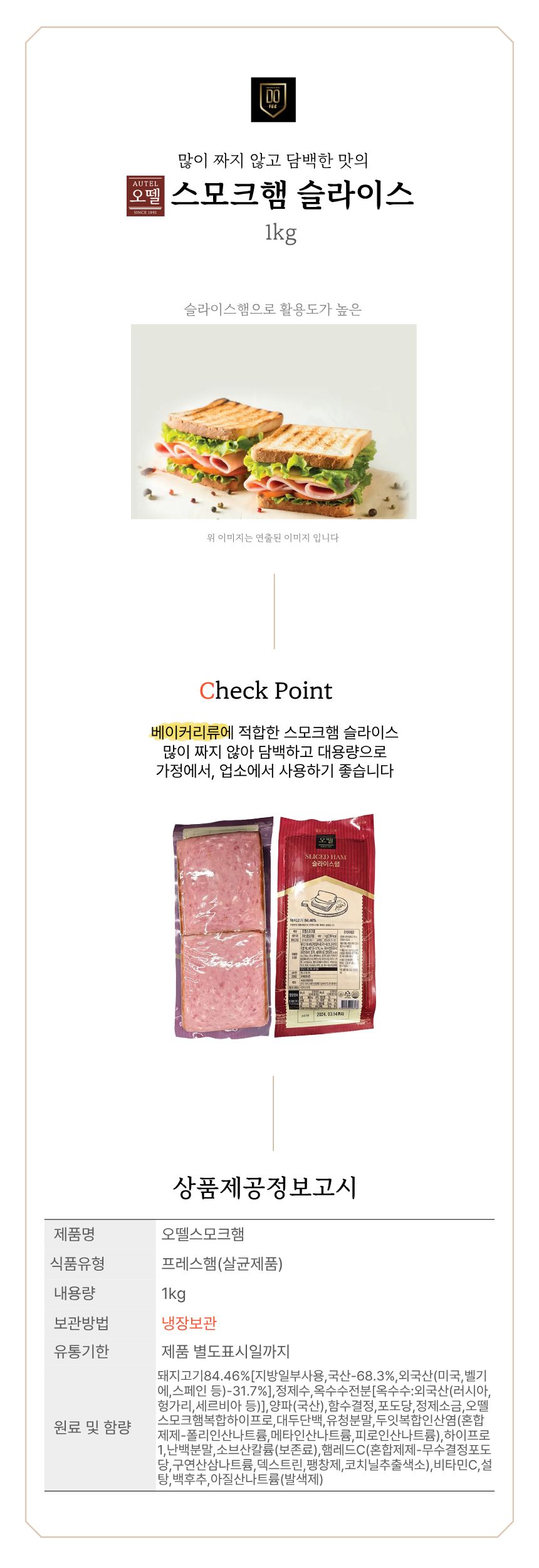 [단품] 오뗄 스모크햄 슬라이스 1kg 냉장 베이커리 훈제햄