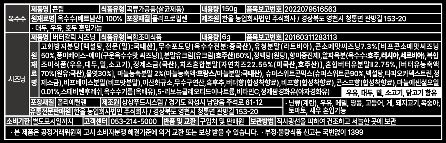 한울 콘립(버터갈릭시즈닝동봉 150g/EA) 이미지