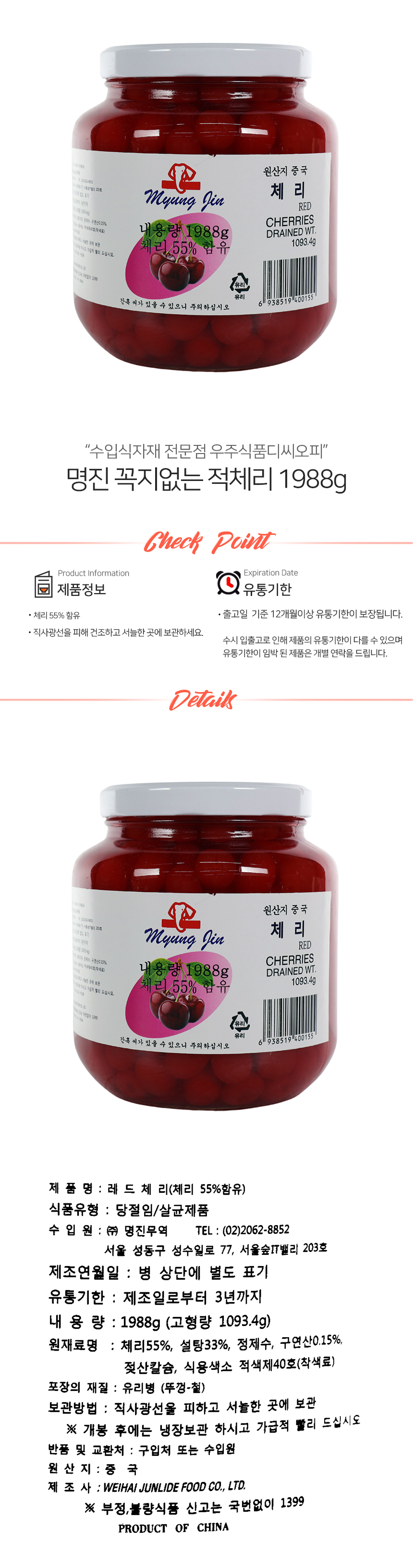 명진 꼭지없는 적체리 1988g (상온)