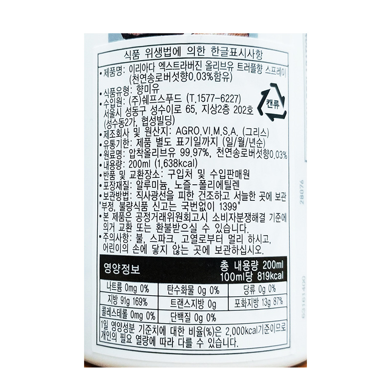 이리아다 올리브유(200ml_칼라마타_엑스트라버진_트러플향_스프레이 200g/EA) 이미지