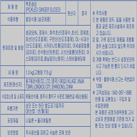 동보식품 백초생강채(1.3Kg/EA) 이미지