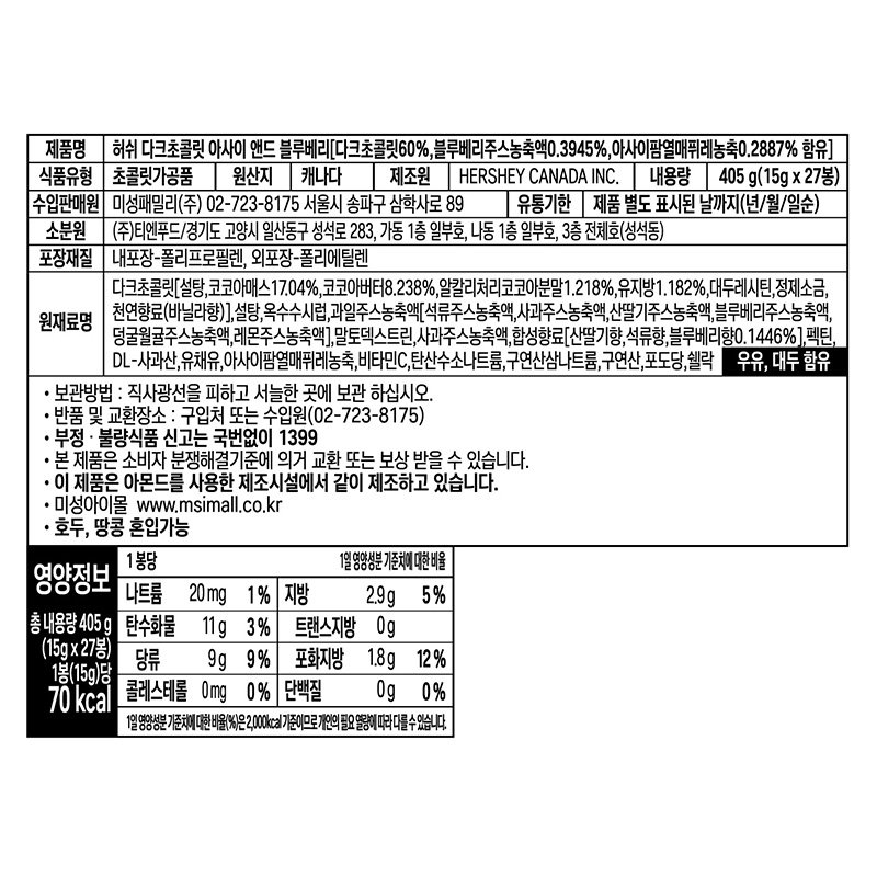 허쉬 다크초콜릿(아사이&블루베리_15g*27입 405g/EA)