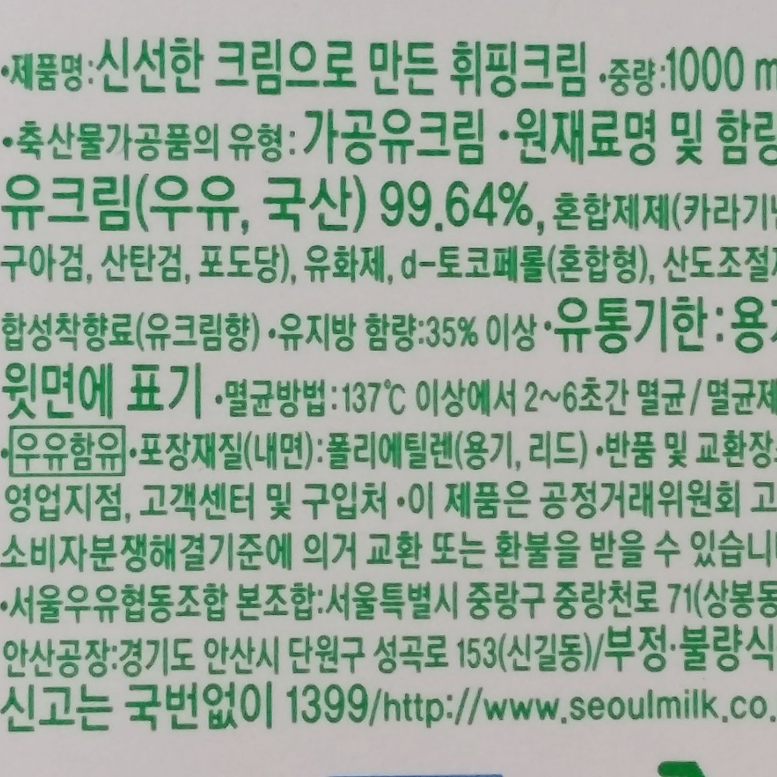 서울우유 휘핑크림(동물성 1Kg/EA) 이미지