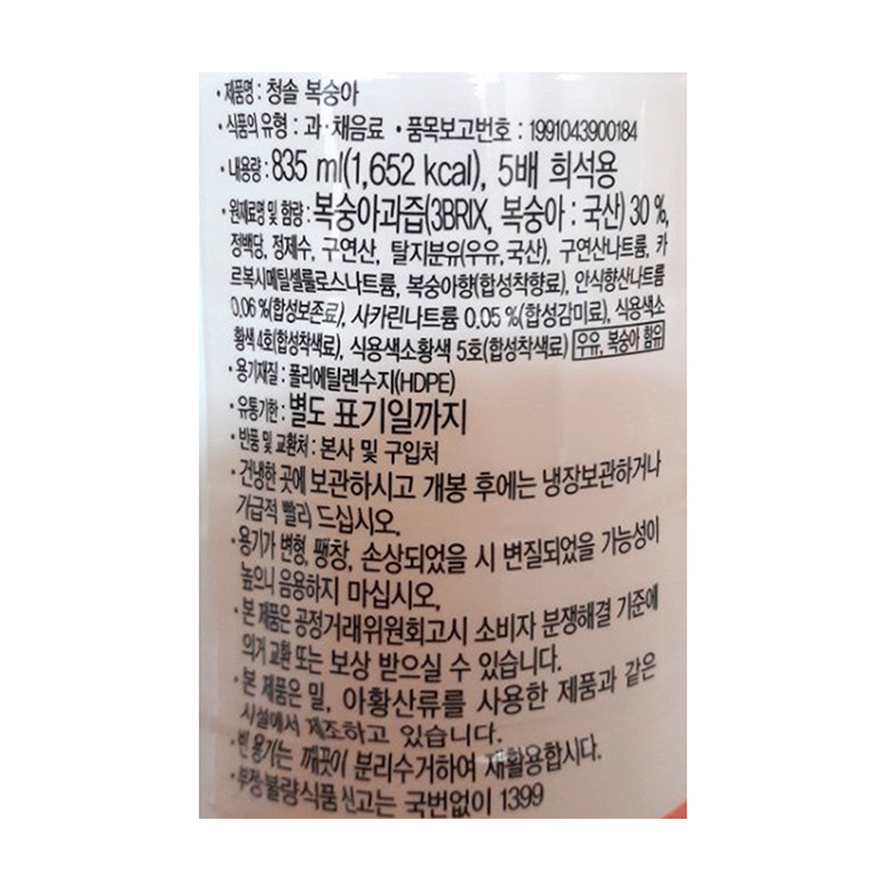 청솔FNB 복숭아원액(835ml 835g/EA) 이미지