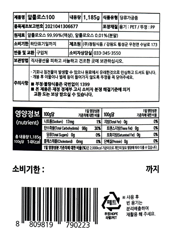 청림식품 알룰로스(100% 1.185Kg/EA)