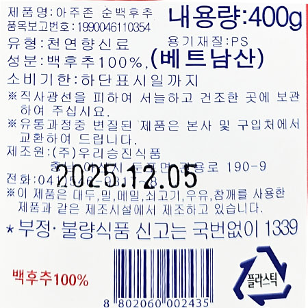 맷돌표 순백후추분말(100% 400g/EA)