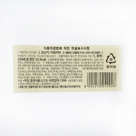 산펠레그리노 탄산음료(330ml_레몬 330g/EA) 이미지