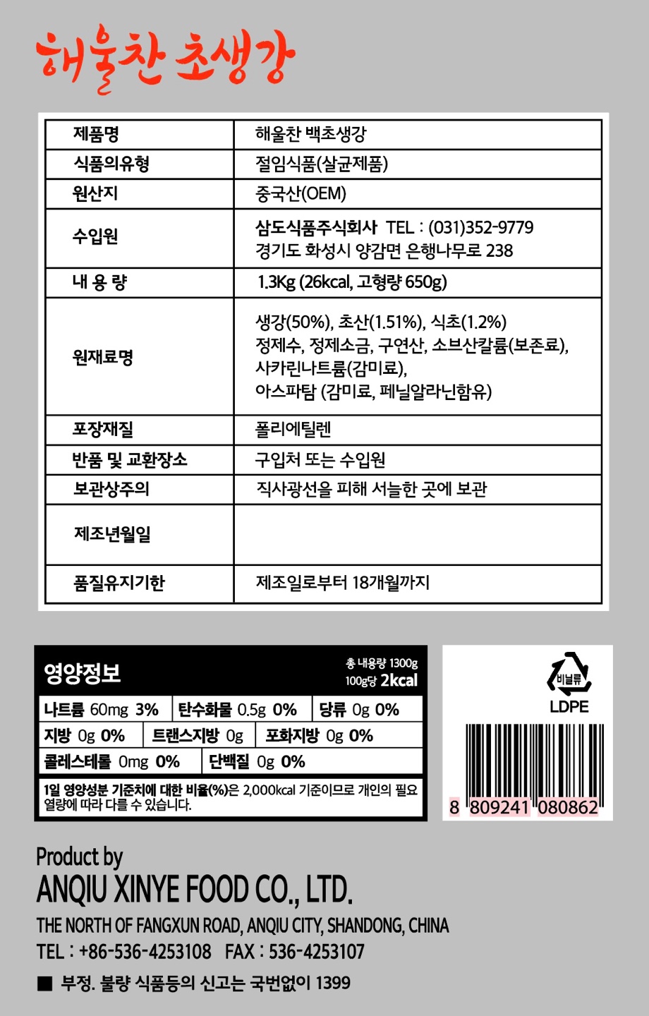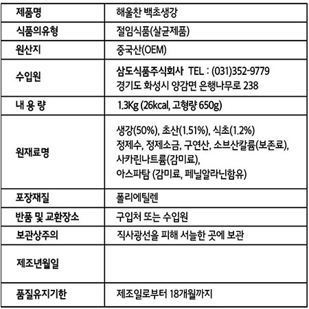 삼도식품 해울찬백초생강(채 1.3Kg/EA)