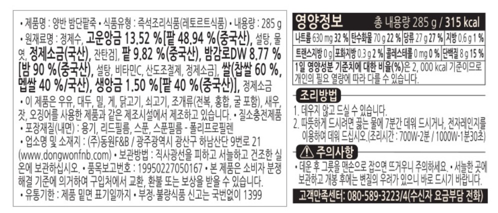 양반밤단팥죽, 285g, 동원F&B,실온