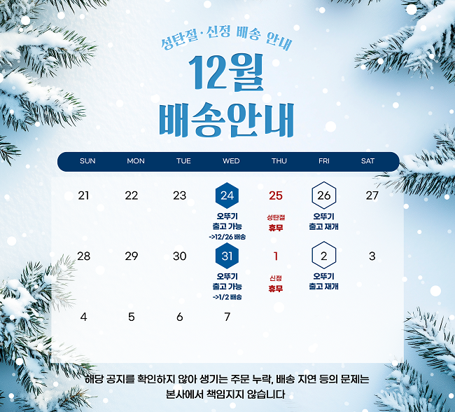 • 택배배송의 경우, 주말 및 공휴일 전일 및 당일에는 상품 발송이 어려울 수 있습니다.