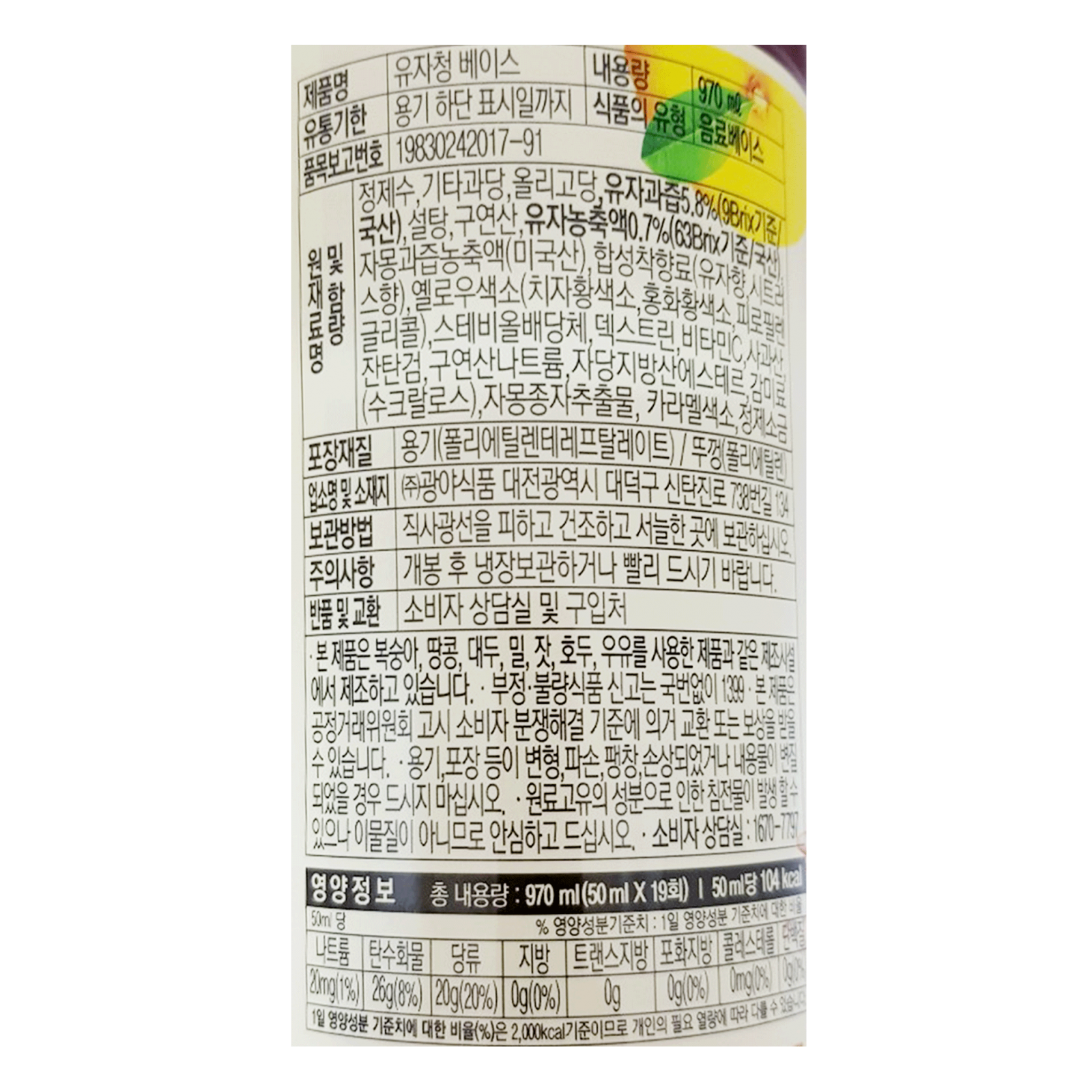광야식품 유자청(970mL_4배희석 970g/EA)