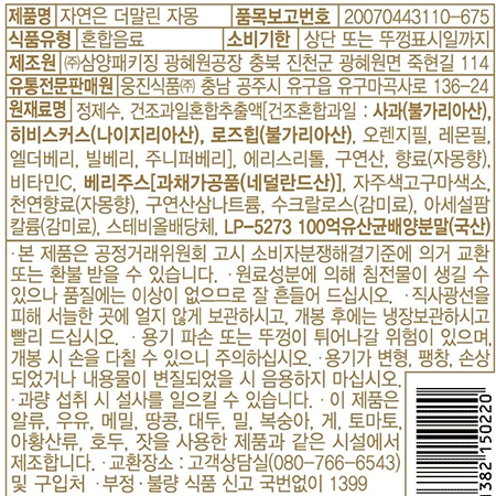 본 제품은 제품입고일별 유통기한 또는 품질유지기한이 상이하므로, 필요시 고객센터로 문의하여 주십시오. 제조일로부터 365일 까지