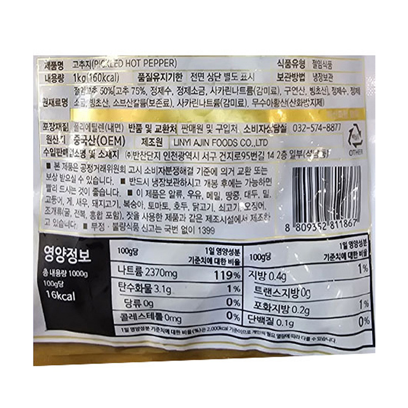 반찬단지 한끼뚝딱고추지(절임고추50% 1Kg/EA)
