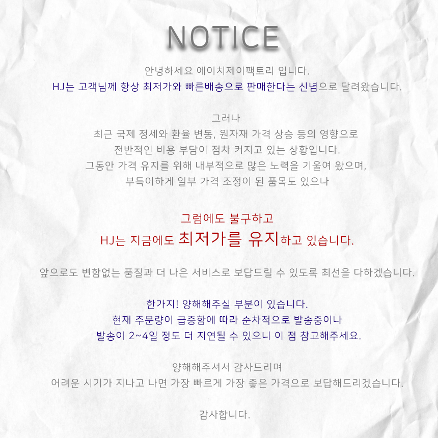 • 택배배송의 경우, 주말 및 공휴일 전일 및 당일에는 상품 발송이 어려울 수 있습니다.