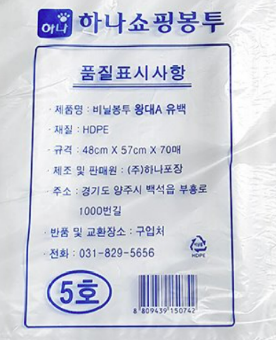하나포장 비닐쇼핑백(백유백 대 37X46cm) 70매