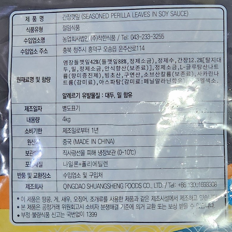 착한식품 간장깻잎 4kg 냉장
