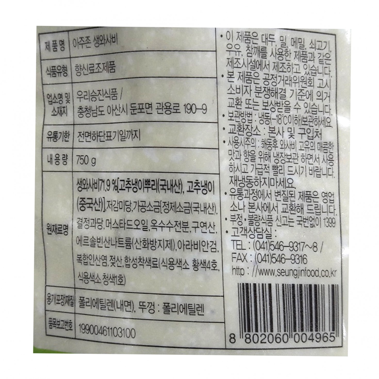 맷돌표 생와사비303 튜브형 750g 냉동 이미지