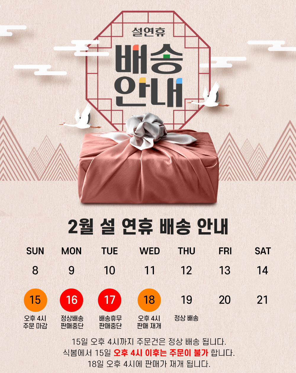 • 택배배송의 경우, 주말 및 공휴일 전일 및 당일에는 상품 발송이 어려울 수 있습니다.