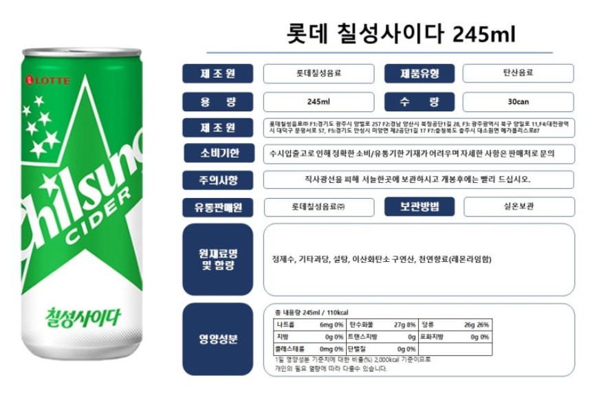 롯데)칠성 사이다 245슬림캔 (245ml*30EA)