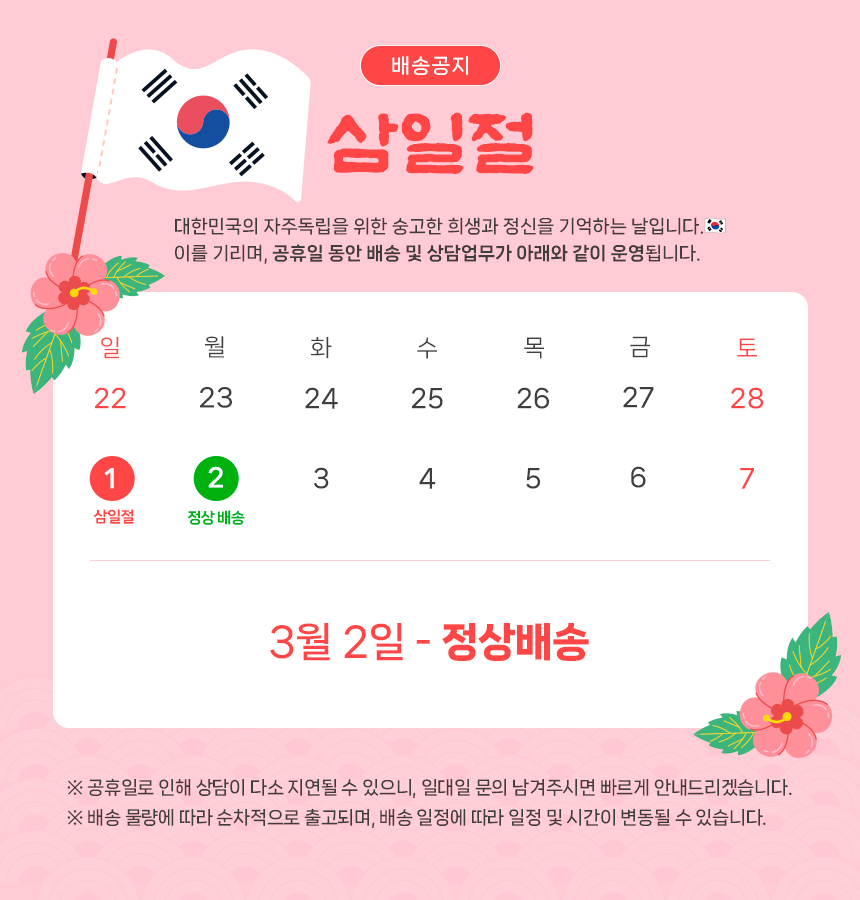 • 택배배송의 경우, 주말 및 공휴일 전일 및 당일에는 상품 발송이 어려울 수 있습니다.