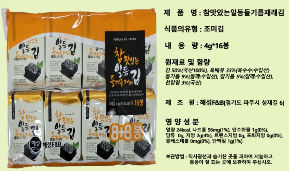 굿[박스판매] 광천)일등 들기름 재래김 {4g*16봉(16단)*10봉} 도시락김 이미지