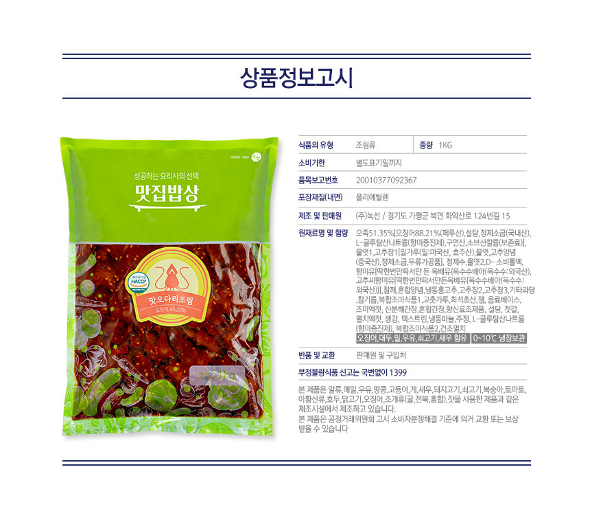 맛집밥상의 맛오다리조림은 HACCP 인증을 받은 공장에서 제조하기 때문에 안심하고 드셔도 괜찮습니다