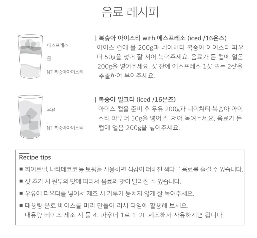 물에 네이쳐티 복숭아 아이스티 파우더를 넣어 저어주면 완성!!!