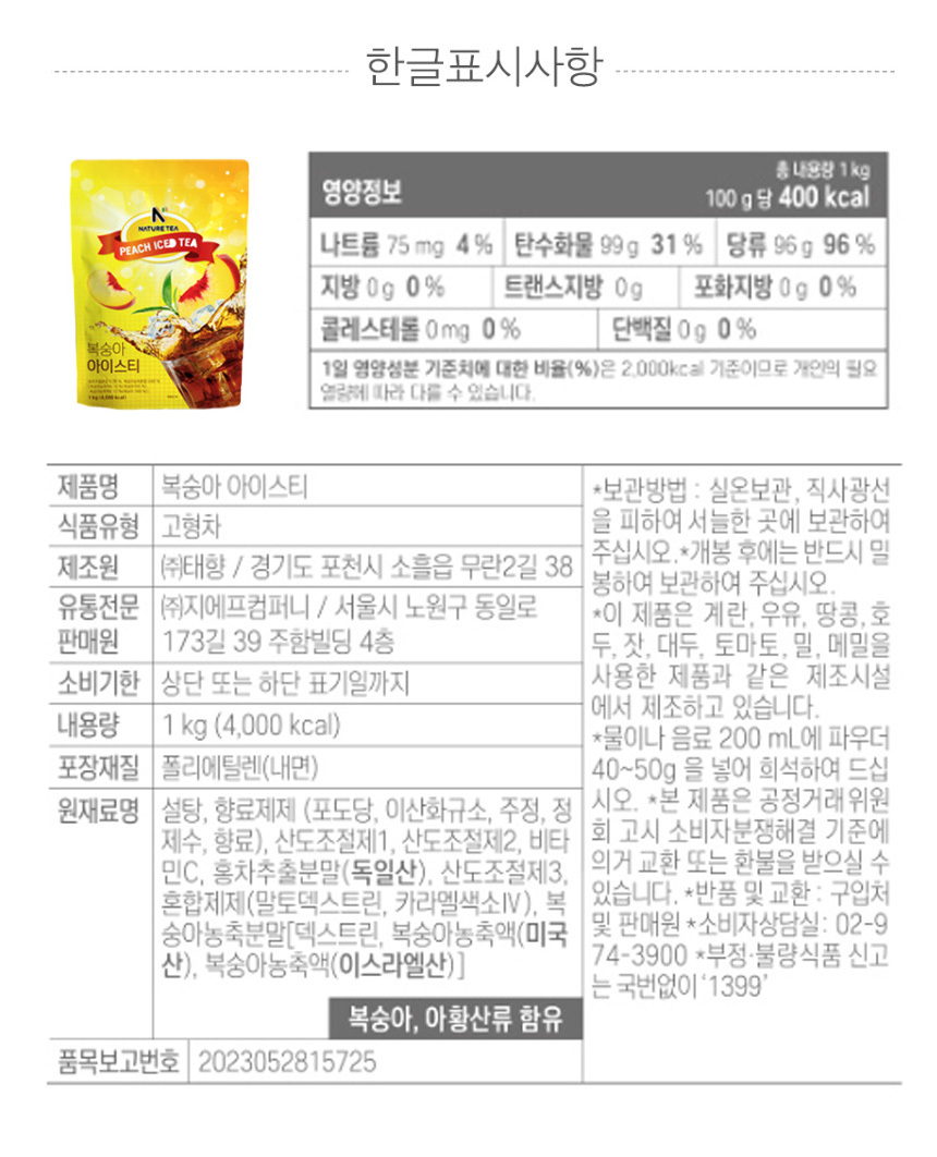 네이쳐티 복숭아 아이스티 파우더 1kg