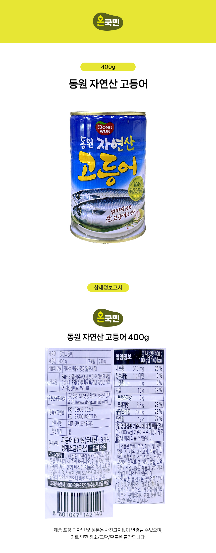 동원 자연산 고등어캔 400g
