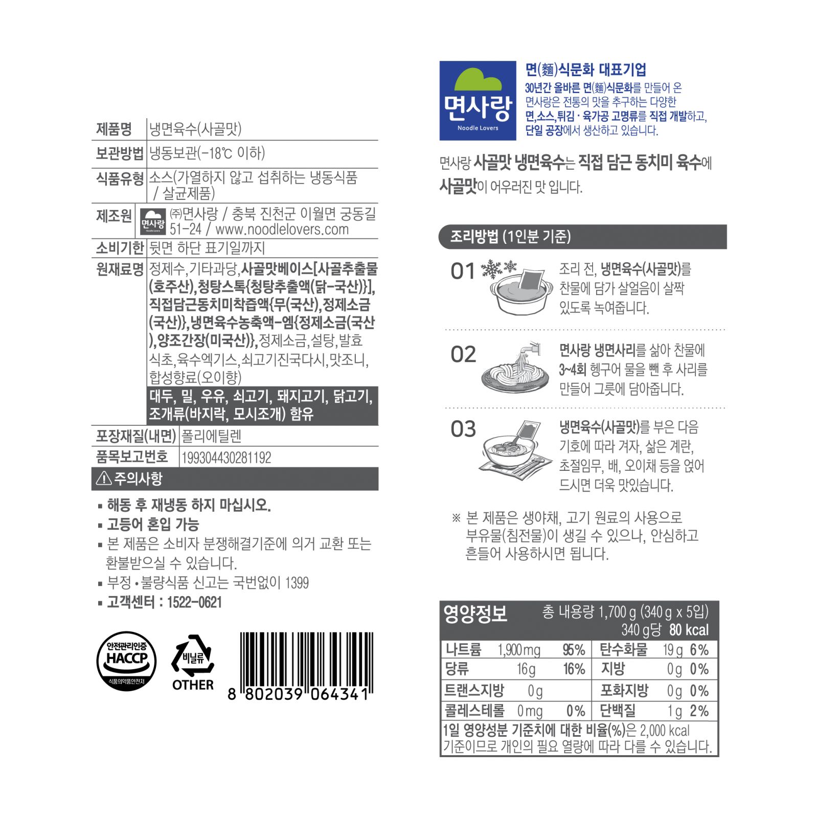 (냉동)사골맛냉면육수 1.7kg (340g*5)_면사랑