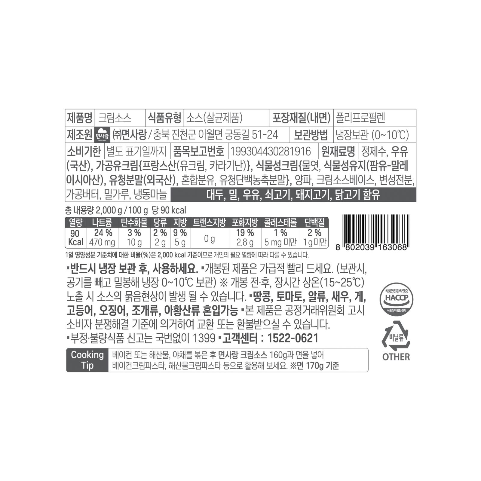 (냉장)크림소스 2kg_면사랑