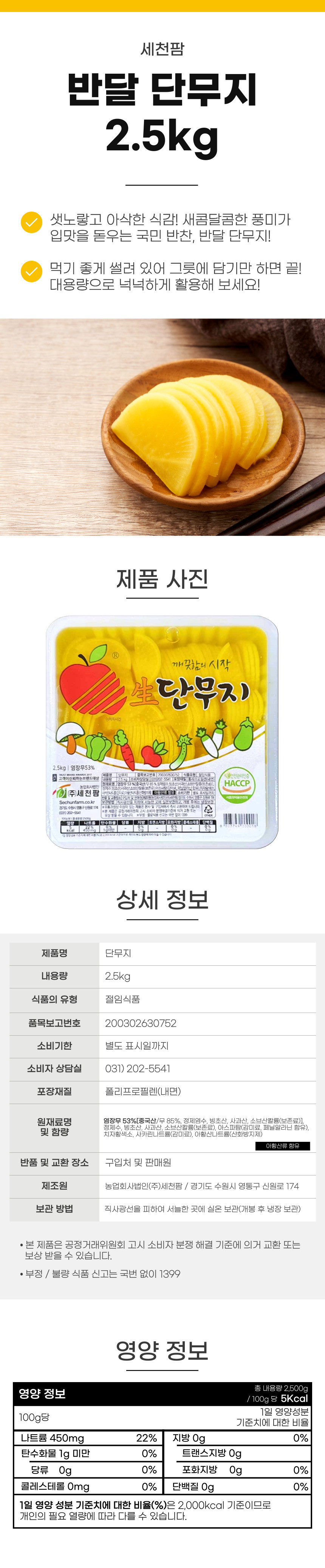 세천팜 반달 단무지 2.5kg 업소용 반찬 반달단무지