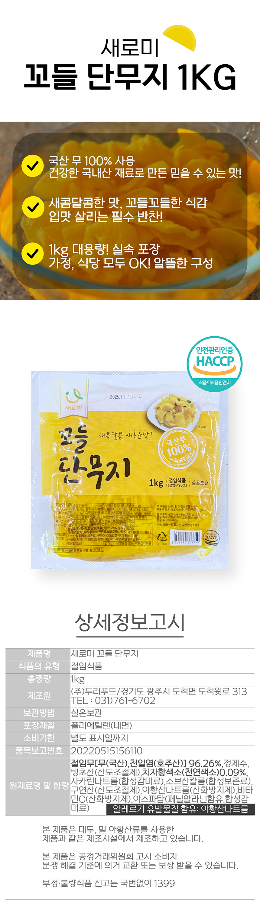 새로미 꼬들 단무지 1kg 반찬 치자단무지