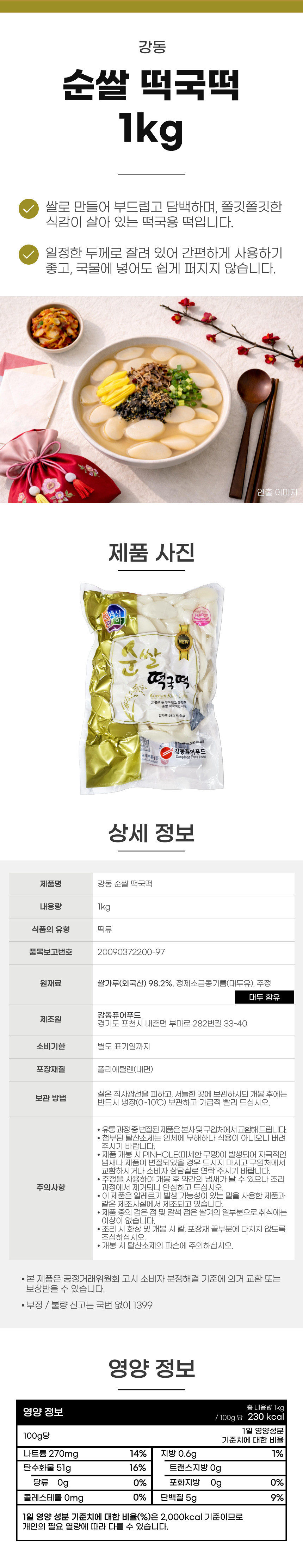 강동 떡국떡 1kg 순쌀 쌀떡 이미지