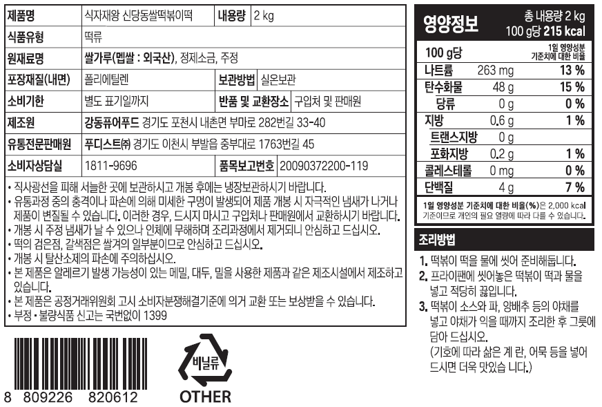 식자재왕 쌀떡볶이 신당동 수입 2kg
