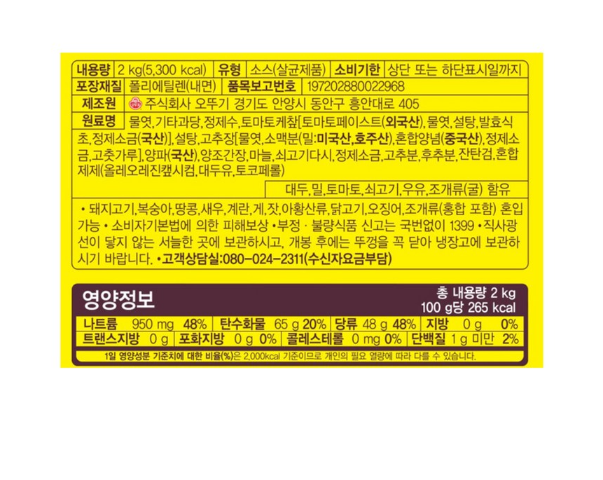 오뚜기 오쉐프 닭강정소스 2kg 스파우트