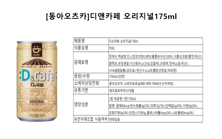 ![[동아오츠카]디엔카페 오리지널175mlx(30캔)/캔커피/업소음료/서비스음료/소캔음료/노래방음료 이미지](https://content.foodspring.co.kr/vendor/2381/images/102_2174434016_r.jpg?f=webp&s=876x876&t=inside)