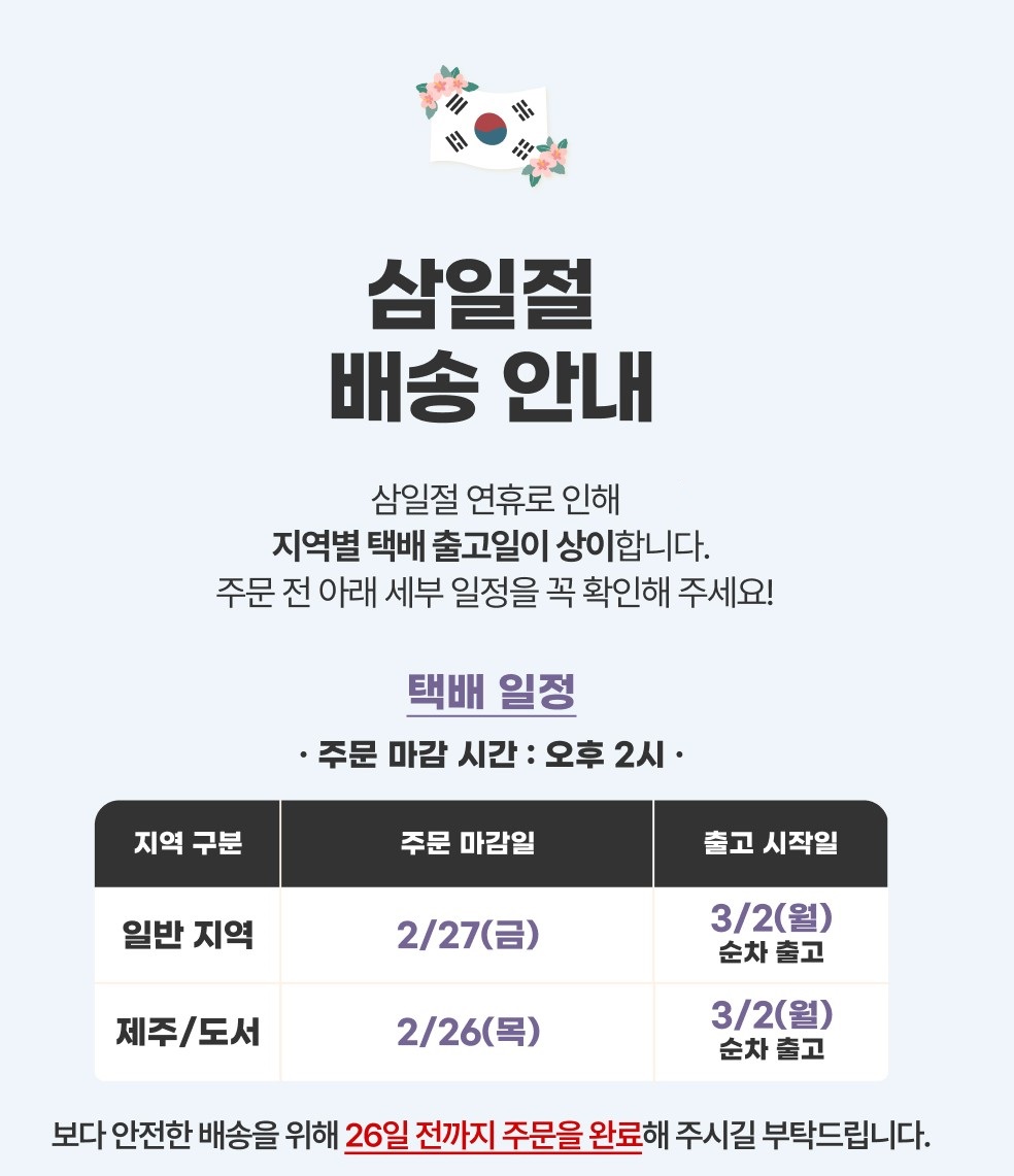 ※ 제주, 도서산간지역의 경우 추가배송비 발생될 수 있으며 주문 확인 후 추가 금액 입금 관련하여 안내드릴 예정입니다.