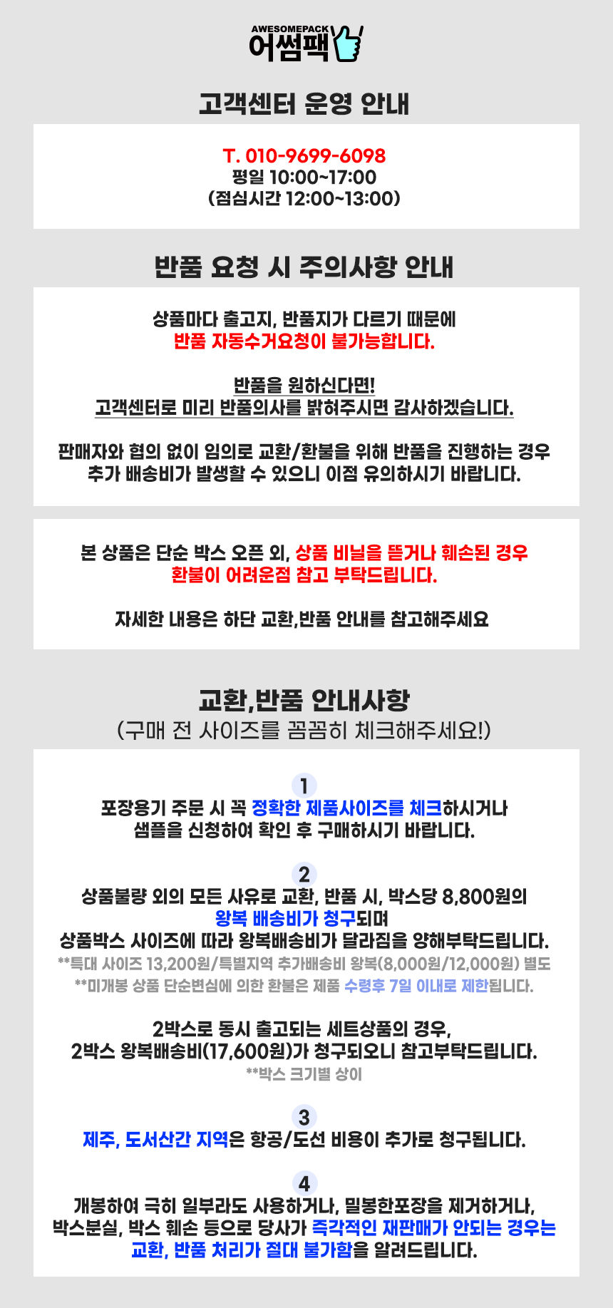 - 교환, 반품 시 왕복 배송비 8,800원이 부과됩니다. (세트상품(2박스)의 경우 17,600원)
