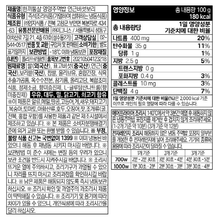 한끼통살 영양주먹밥(연근버섯보리 100g/EA) 이미지
