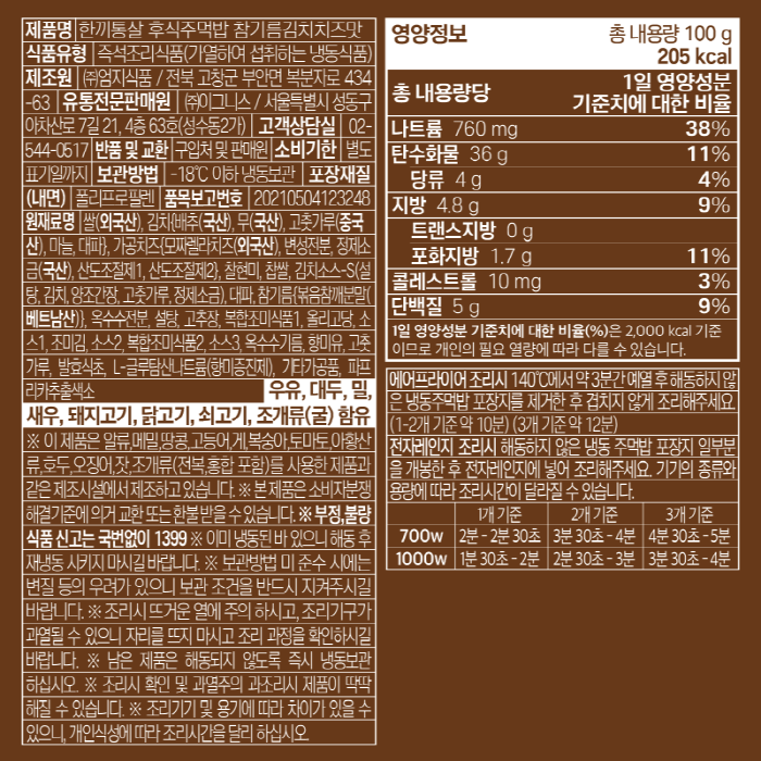 한끼통살 후식주먹밥(참기름김치치즈맛 100g/EA) 이미지
