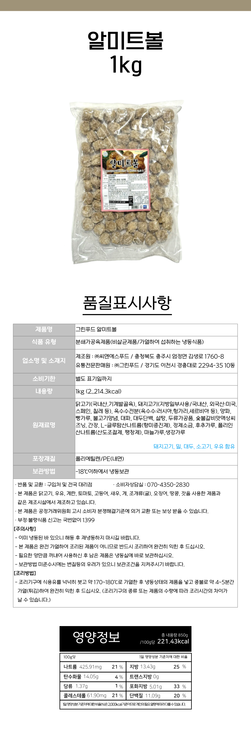 그린푸드 알미트볼 1kg 냉동 튀김 반찬 대용량